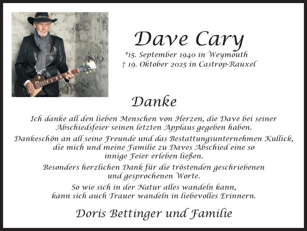 Hier finden Sie alle Traueranzeigen aus der Zeitung, die bisher für Dave Cary erschienen sind. Weitere Traueranzeigen, die in der Zeitung erscheinen, werden hier ebenfalls aufgelistet