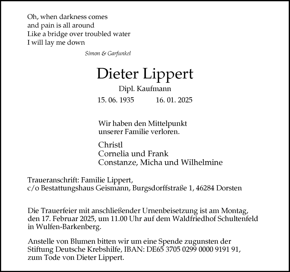 Hier finden Sie alle Traueranzeigen aus der Zeitung, die bisher für Dieter Lippert erschienen sind. Weitere Traueranzeigen, die in der Zeitung erscheinen, werden hier ebenfalls aufgelistet