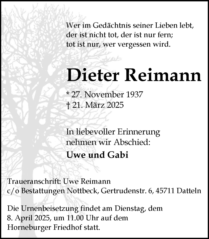 Hier finden Sie alle Traueranzeigen aus der Zeitung, die bisher für Dieter Reimann erschienen sind. Weitere Traueranzeigen, die in der Zeitung erscheinen, werden hier ebenfalls aufgelistet