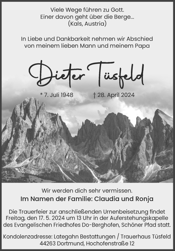 Hier finden Sie alle Traueranzeigen aus der Zeitung, die bisher für Dieter Tüsfeld erschienen sind. Weitere Traueranzeigen, die in der Zeitung erscheinen, werden hier ebenfalls aufgelistet