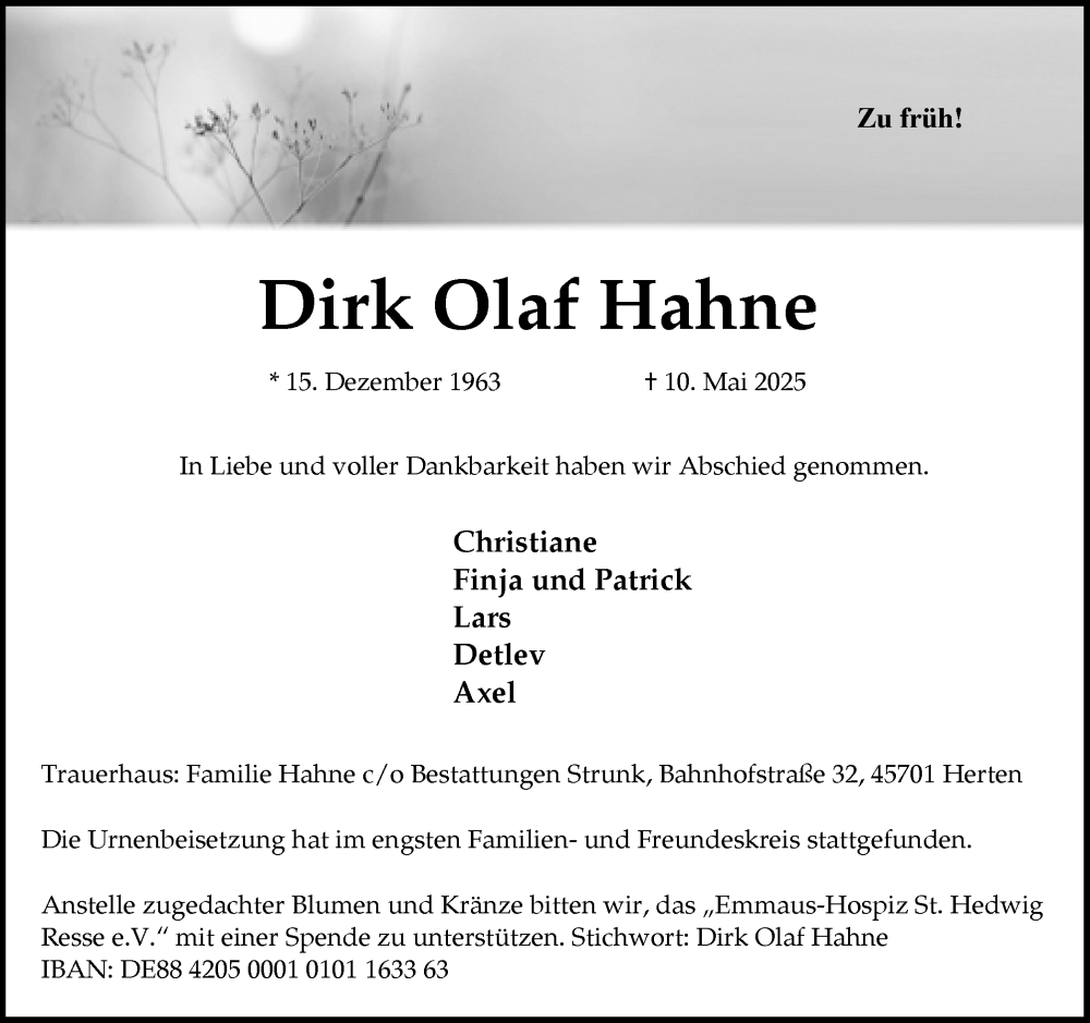 Hier finden Sie alle Traueranzeigen aus der Zeitung, die bisher für Dirk Olaf Hahne erschienen sind. Weitere Traueranzeigen, die in der Zeitung erscheinen, werden hier ebenfalls aufgelistet