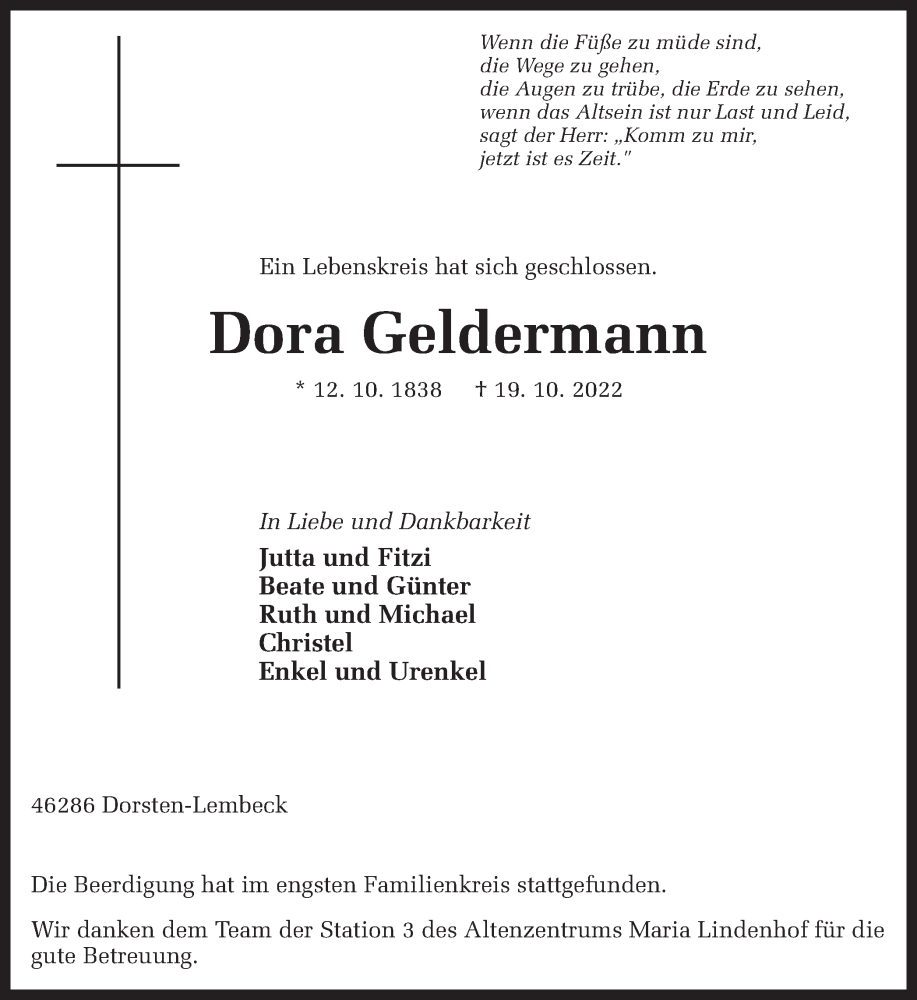 Hier finden Sie alle Traueranzeigen aus der Zeitung, die bisher für Dora Geldermann erschienen sind. Weitere Traueranzeigen, die in der Zeitung erscheinen, werden hier ebenfalls aufgelistet