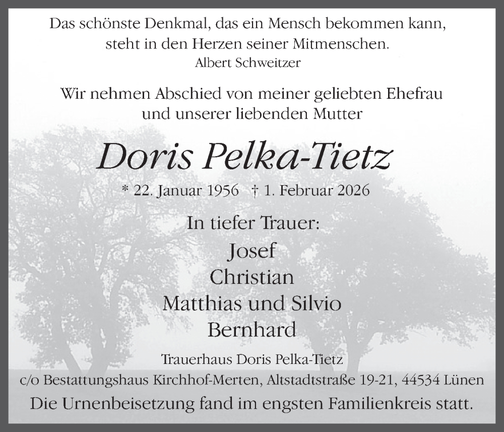 Hier finden Sie alle Traueranzeigen aus der Zeitung, die bisher für Doris Pelka-Tietz erschienen sind. Weitere Traueranzeigen, die in der Zeitung erscheinen, werden hier ebenfalls aufgelistet