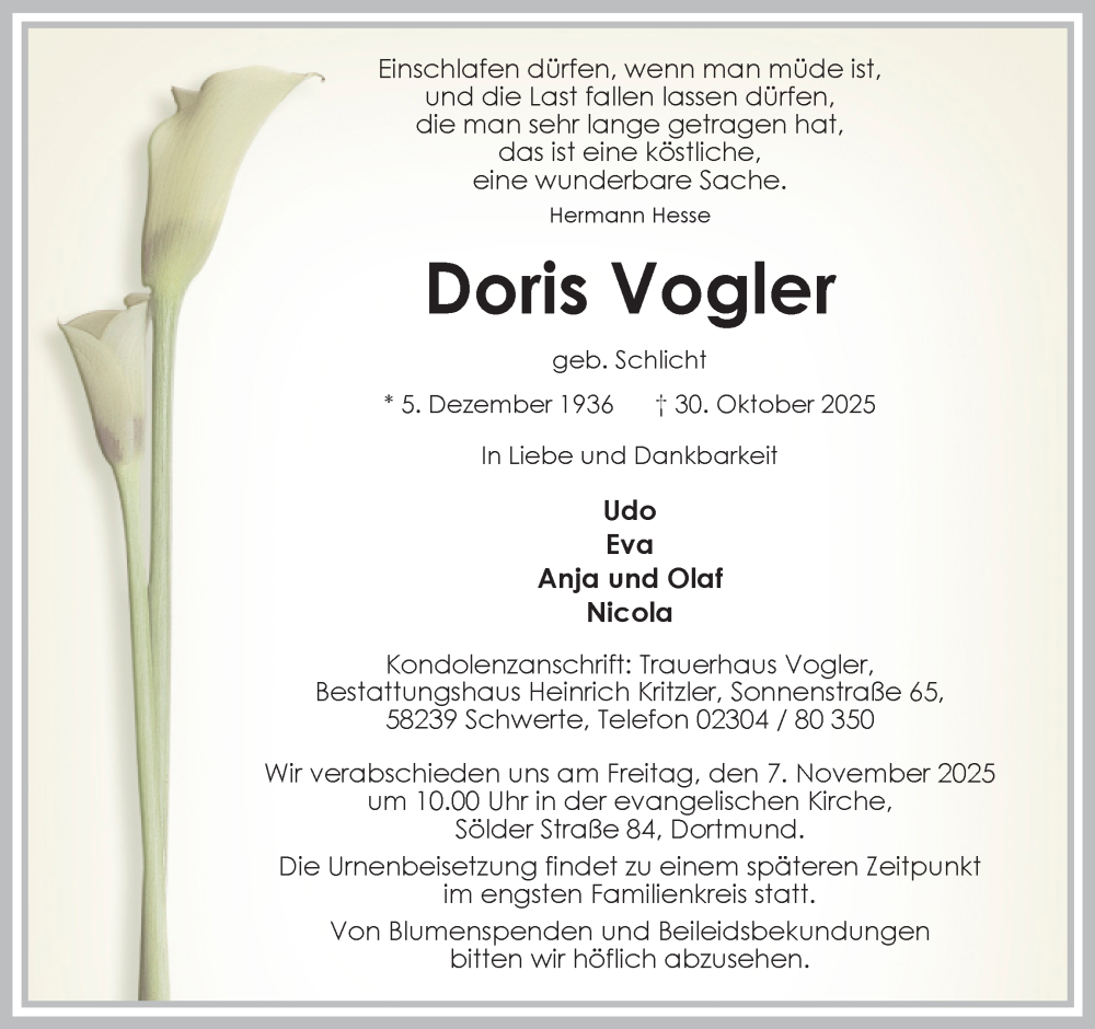 Hier finden Sie alle Traueranzeigen aus der Zeitung, die bisher für Doris Vogler erschienen sind. Weitere Traueranzeigen, die in der Zeitung erscheinen, werden hier ebenfalls aufgelistet