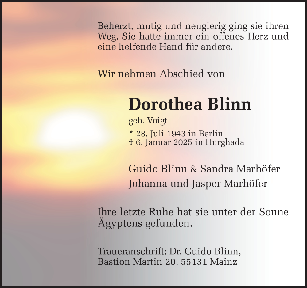 Hier finden Sie alle Traueranzeigen aus der Zeitung, die bisher für Dorothea Blinn erschienen sind. Weitere Traueranzeigen, die in der Zeitung erscheinen, werden hier ebenfalls aufgelistet
