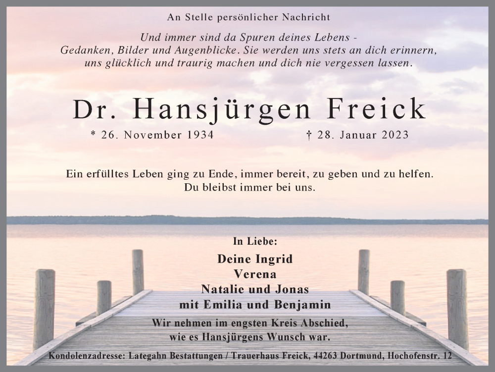 Hier finden Sie alle Traueranzeigen aus der Zeitung, die bisher für Dr. Hansjürgen Freick erschienen sind. Weitere Traueranzeigen, die in der Zeitung erscheinen, werden hier ebenfalls aufgelistet