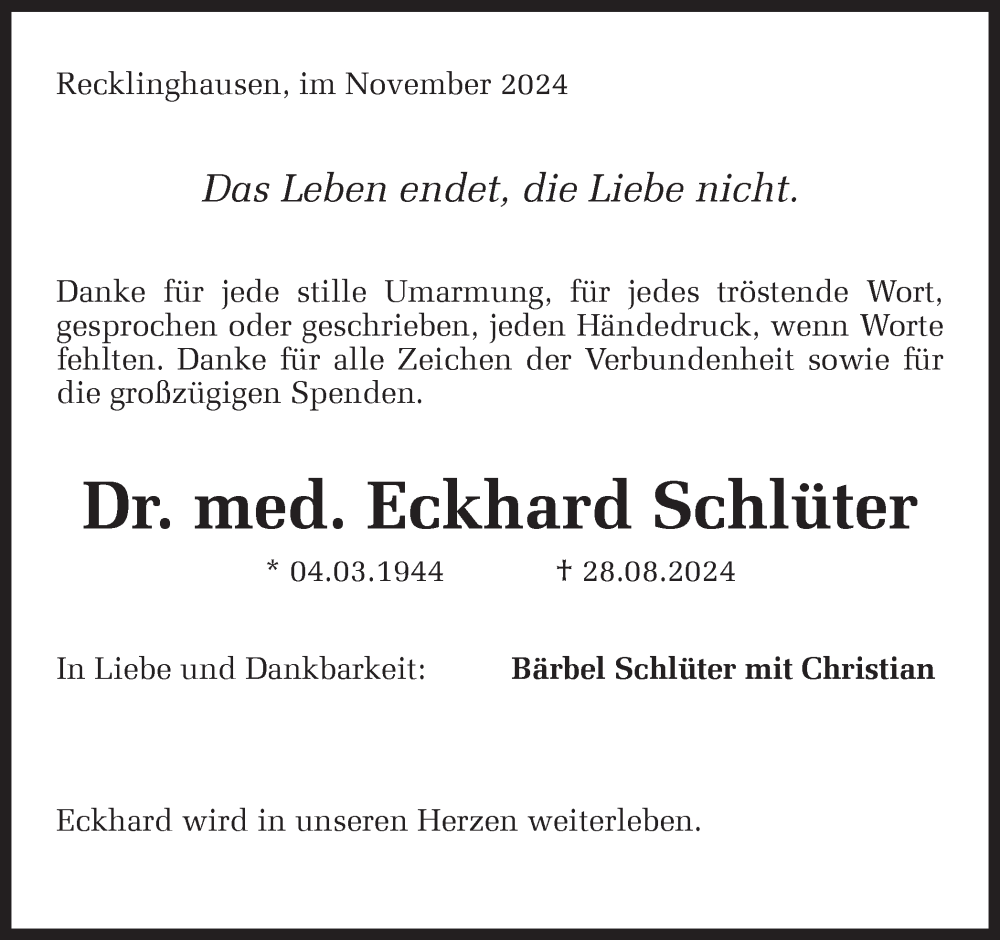 Hier finden Sie alle Traueranzeigen aus der Zeitung, die bisher für Eckhard Schlüter erschienen sind. Weitere Traueranzeigen, die in der Zeitung erscheinen, werden hier ebenfalls aufgelistet