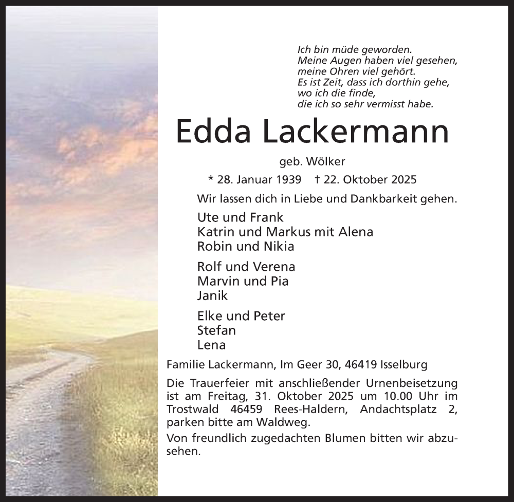 Hier finden Sie alle Traueranzeigen aus der Zeitung, die bisher für Edda Lackermann erschienen sind. Weitere Traueranzeigen, die in der Zeitung erscheinen, werden hier ebenfalls aufgelistet