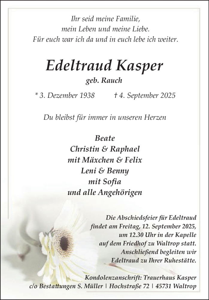 Hier finden Sie alle Traueranzeigen aus der Zeitung, die bisher für Edeltraud Kasper erschienen sind. Weitere Traueranzeigen, die in der Zeitung erscheinen, werden hier ebenfalls aufgelistet