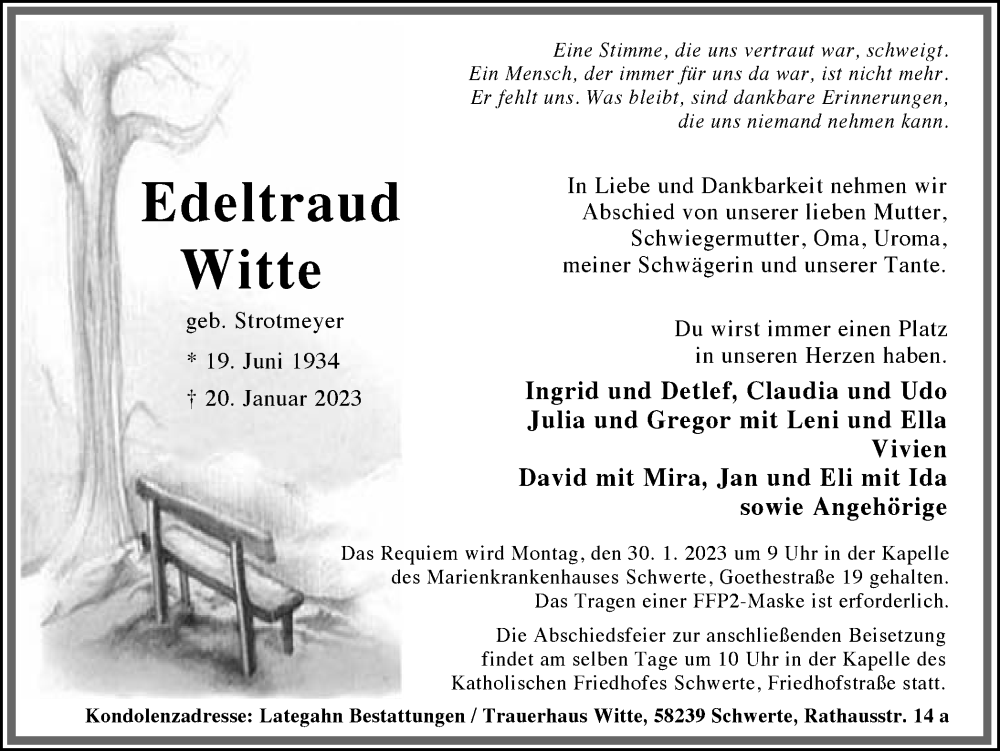 Hier finden Sie alle Traueranzeigen aus der Zeitung, die bisher für Edeltraud Witte erschienen sind. Weitere Traueranzeigen, die in der Zeitung erscheinen, werden hier ebenfalls aufgelistet