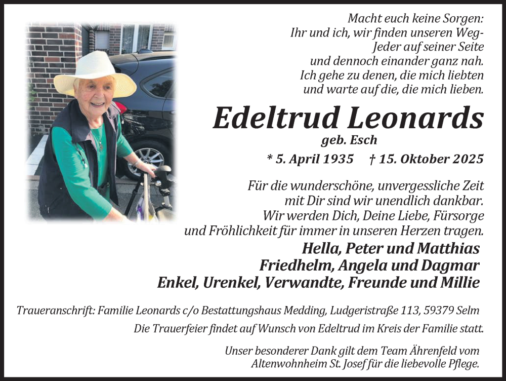 Hier finden Sie alle Traueranzeigen aus der Zeitung, die bisher für Edeltrud Leonards erschienen sind. Weitere Traueranzeigen, die in der Zeitung erscheinen, werden hier ebenfalls aufgelistet