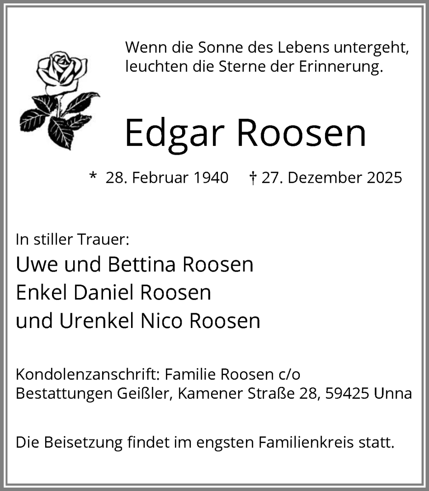 Hier finden Sie alle Traueranzeigen aus der Zeitung, die bisher für Edgar Roosen erschienen sind. Weitere Traueranzeigen, die in der Zeitung erscheinen, werden hier ebenfalls aufgelistet