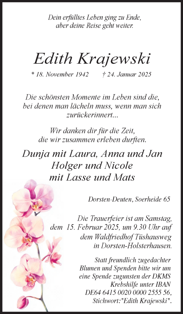 Hier finden Sie alle Traueranzeigen aus der Zeitung, die bisher für Edith Krajewski erschienen sind. Weitere Traueranzeigen, die in der Zeitung erscheinen, werden hier ebenfalls aufgelistet