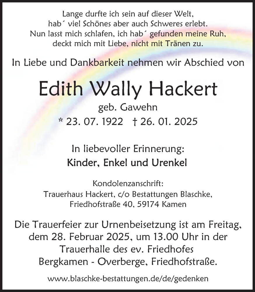 Hier finden Sie alle Traueranzeigen aus der Zeitung, die bisher für Edith Wally Hackert erschienen sind. Weitere Traueranzeigen, die in der Zeitung erscheinen, werden hier ebenfalls aufgelistet