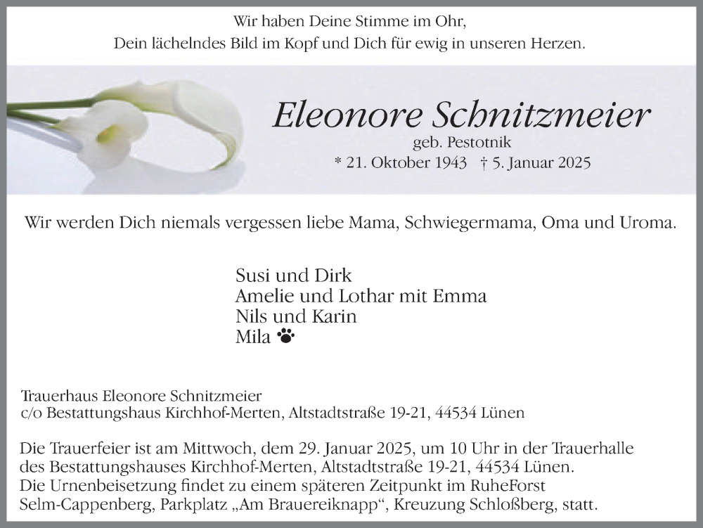 Hier finden Sie alle Traueranzeigen aus der Zeitung, die bisher für Eleonore Schnitzmeier erschienen sind. Weitere Traueranzeigen, die in der Zeitung erscheinen, werden hier ebenfalls aufgelistet