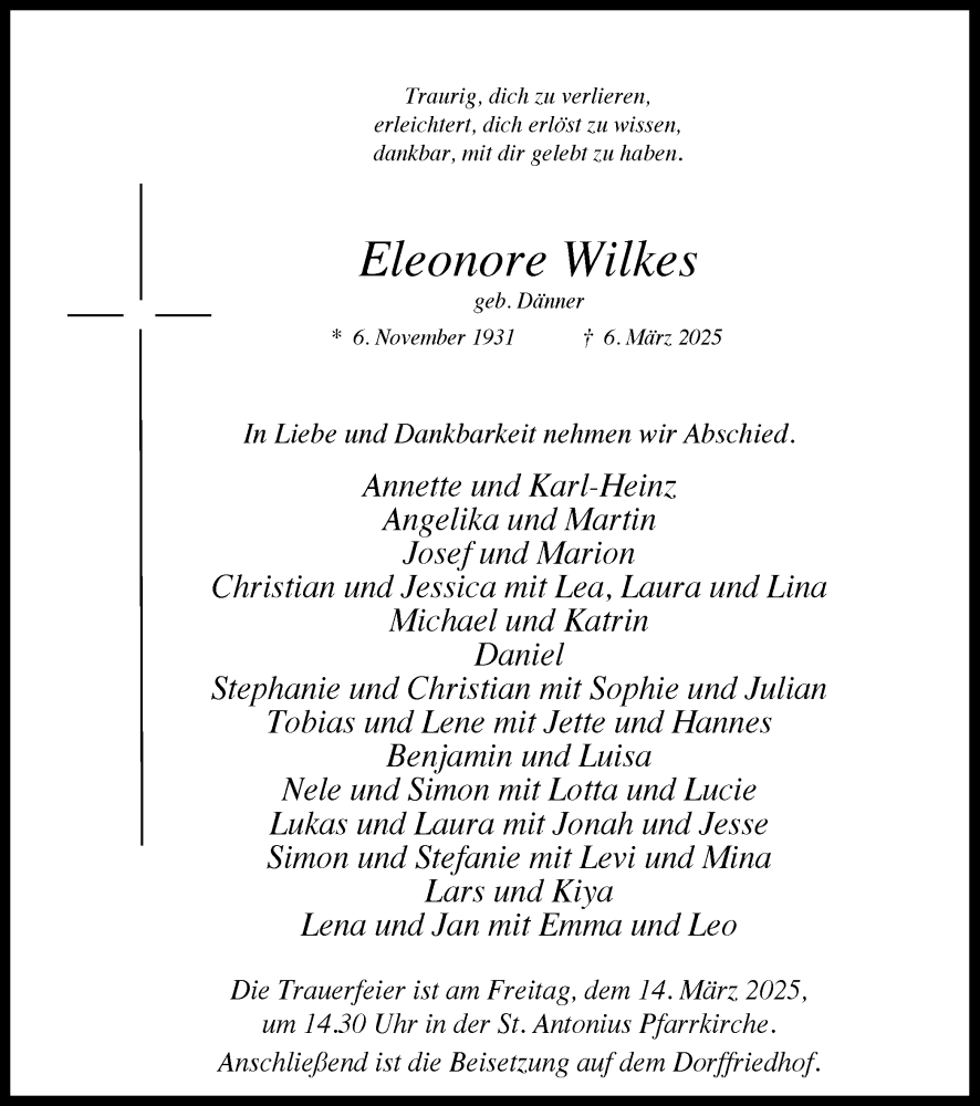 Hier finden Sie alle Traueranzeigen aus der Zeitung, die bisher für Eleonore Wilkes erschienen sind. Weitere Traueranzeigen, die in der Zeitung erscheinen, werden hier ebenfalls aufgelistet
