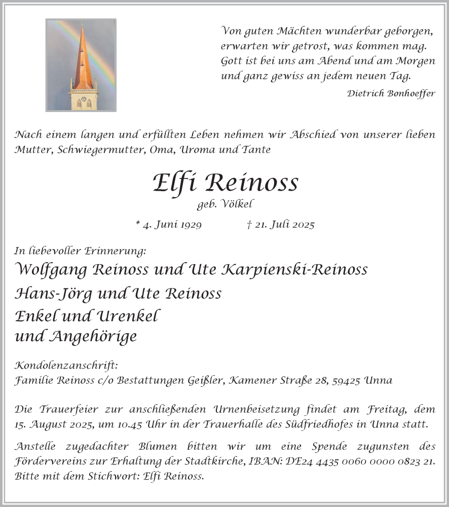 Hier finden Sie alle Traueranzeigen aus der Zeitung, die bisher für Elfi Reinoss erschienen sind. Weitere Traueranzeigen, die in der Zeitung erscheinen, werden hier ebenfalls aufgelistet