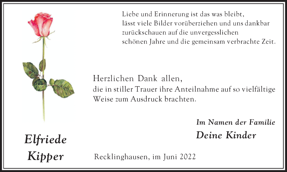 Hier finden Sie alle Traueranzeigen aus der Zeitung, die bisher für Elfriede Kipper erschienen sind. Weitere Traueranzeigen, die in der Zeitung erscheinen, werden hier ebenfalls aufgelistet