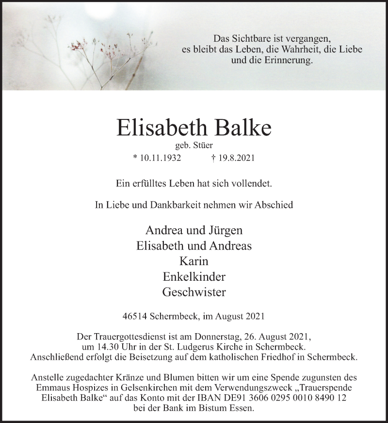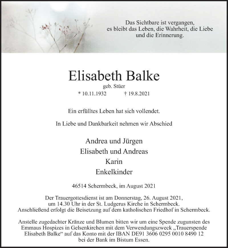 Hier finden Sie alle Traueranzeigen aus der Zeitung, die bisher für Elisabeth Balke erschienen sind. Weitere Traueranzeigen, die in der Zeitung erscheinen, werden hier ebenfalls aufgelistet