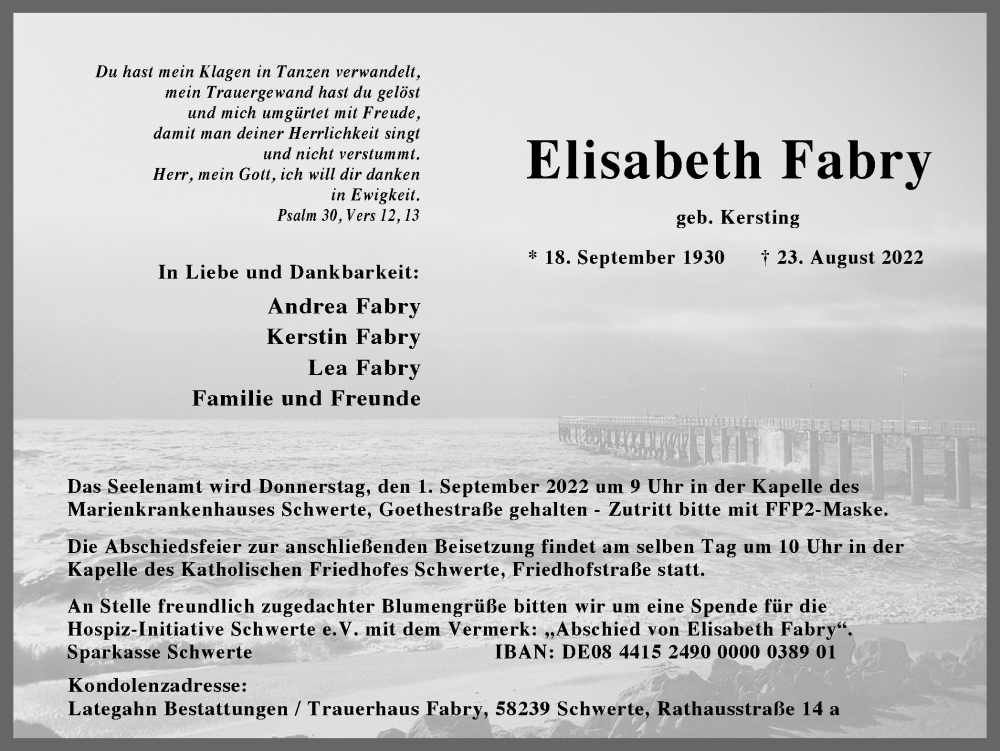 Hier finden Sie alle Traueranzeigen aus der Zeitung, die bisher für Elisabeth Fabry erschienen sind. Weitere Traueranzeigen, die in der Zeitung erscheinen, werden hier ebenfalls aufgelistet