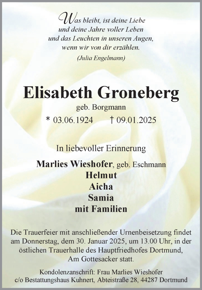 Hier finden Sie alle Traueranzeigen aus der Zeitung, die bisher für Elisabeth Groneberg erschienen sind. Weitere Traueranzeigen, die in der Zeitung erscheinen, werden hier ebenfalls aufgelistet