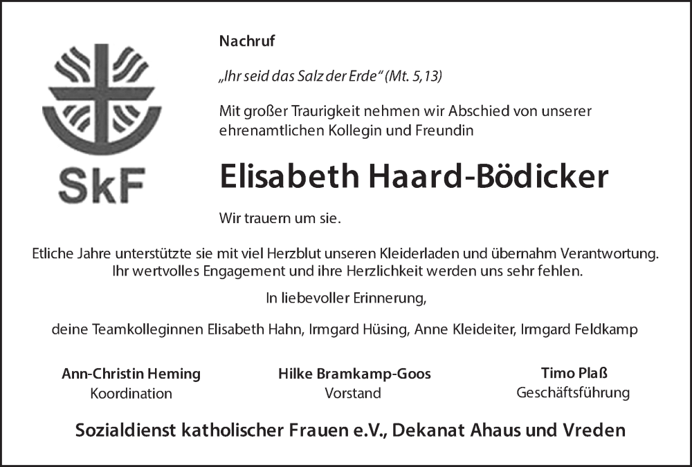 Hier finden Sie alle Traueranzeigen aus der Zeitung, die bisher für Elisabeth Haard-Bödicker erschienen sind. Weitere Traueranzeigen, die in der Zeitung erscheinen, werden hier ebenfalls aufgelistet