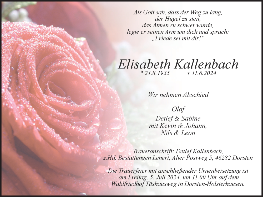Hier finden Sie alle Traueranzeigen aus der Zeitung, die bisher für Elisabeth Kallenbach erschienen sind. Weitere Traueranzeigen, die in der Zeitung erscheinen, werden hier ebenfalls aufgelistet