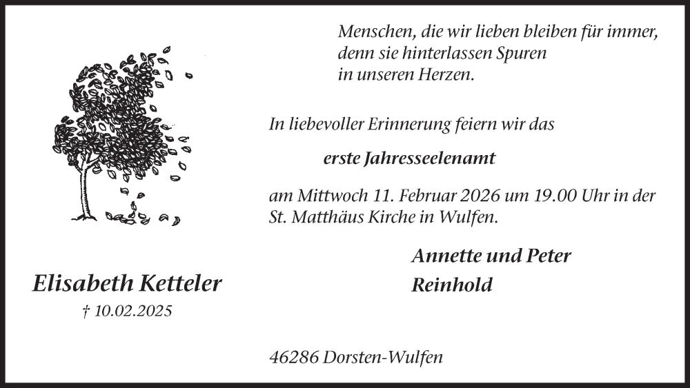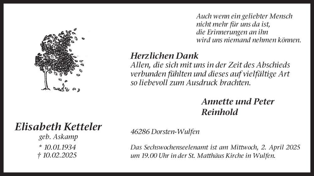 Hier finden Sie alle Traueranzeigen aus der Zeitung, die bisher für Elisabeth Ketteler erschienen sind. Weitere Traueranzeigen, die in der Zeitung erscheinen, werden hier ebenfalls aufgelistet