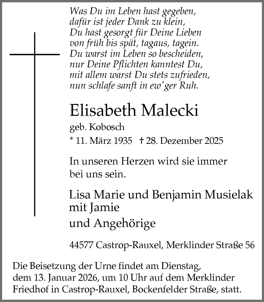 Hier finden Sie alle Traueranzeigen aus der Zeitung, die bisher für Elisabeth Malecki erschienen sind. Weitere Traueranzeigen, die in der Zeitung erscheinen, werden hier ebenfalls aufgelistet