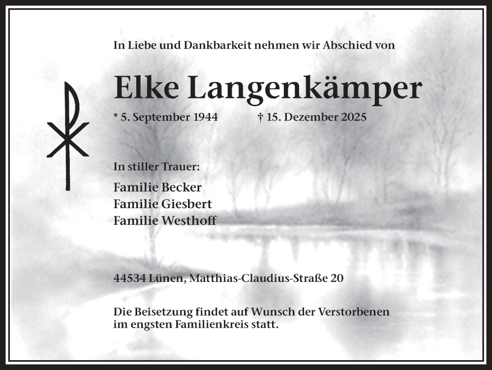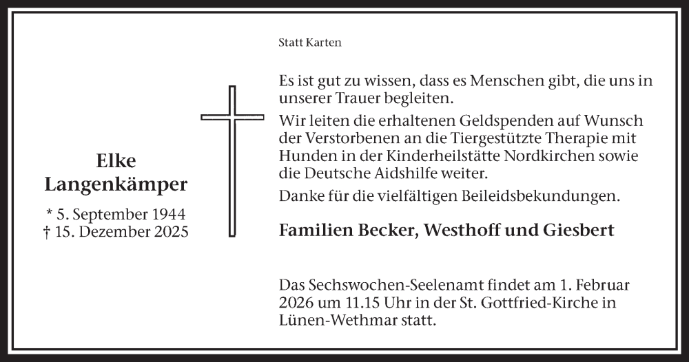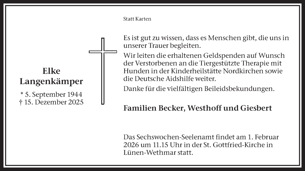 Hier finden Sie alle Traueranzeigen aus der Zeitung, die bisher für Elke Langenkämper erschienen sind. Weitere Traueranzeigen, die in der Zeitung erscheinen, werden hier ebenfalls aufgelistet
