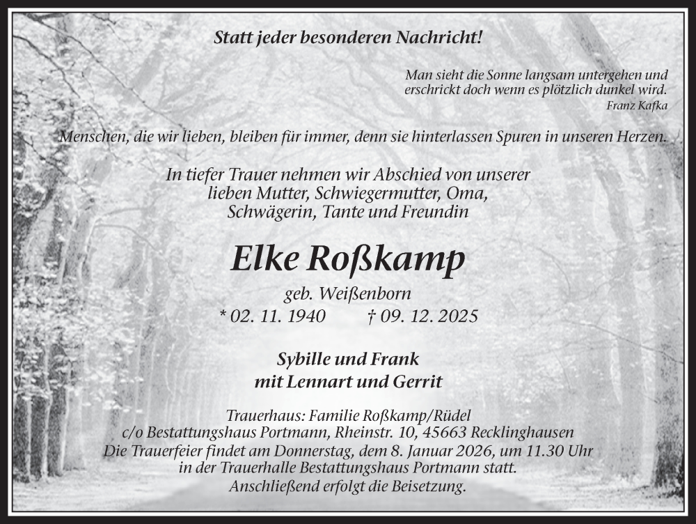 Hier finden Sie alle Traueranzeigen aus der Zeitung, die bisher für Elke Roßkamp erschienen sind. Weitere Traueranzeigen, die in der Zeitung erscheinen, werden hier ebenfalls aufgelistet