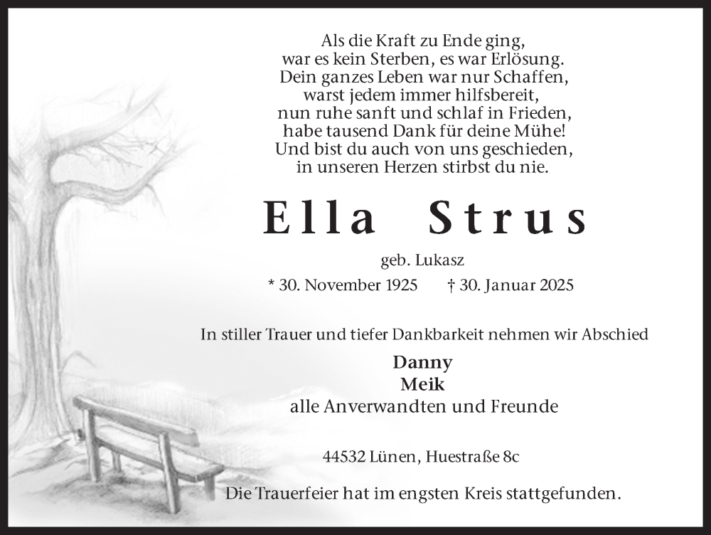 Hier finden Sie alle Traueranzeigen aus der Zeitung, die bisher für Ella Strus erschienen sind. Weitere Traueranzeigen, die in der Zeitung erscheinen, werden hier ebenfalls aufgelistet