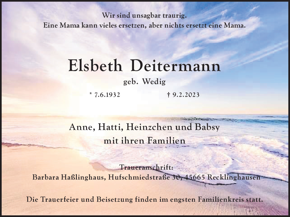 Hier finden Sie alle Traueranzeigen aus der Zeitung, die bisher für Elsbeth Deitermann erschienen sind. Weitere Traueranzeigen, die in der Zeitung erscheinen, werden hier ebenfalls aufgelistet