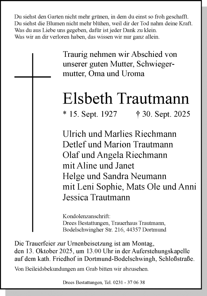 Hier finden Sie alle Traueranzeigen aus der Zeitung, die bisher für Elsbeth Trautmann erschienen sind. Weitere Traueranzeigen, die in der Zeitung erscheinen, werden hier ebenfalls aufgelistet