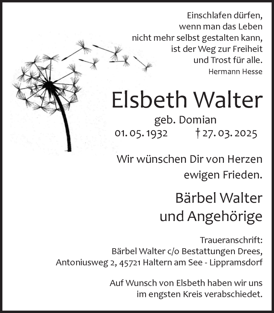 Hier finden Sie alle Traueranzeigen aus der Zeitung, die bisher für Elsbeth Walter erschienen sind. Weitere Traueranzeigen, die in der Zeitung erscheinen, werden hier ebenfalls aufgelistet