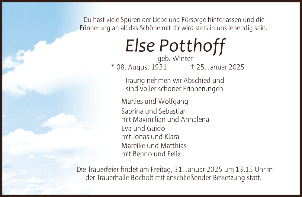 Hier finden Sie alle Traueranzeigen aus der Zeitung, die bisher für Else Potthoff erschienen sind. Weitere Traueranzeigen, die in der Zeitung erscheinen, werden hier ebenfalls aufgelistet