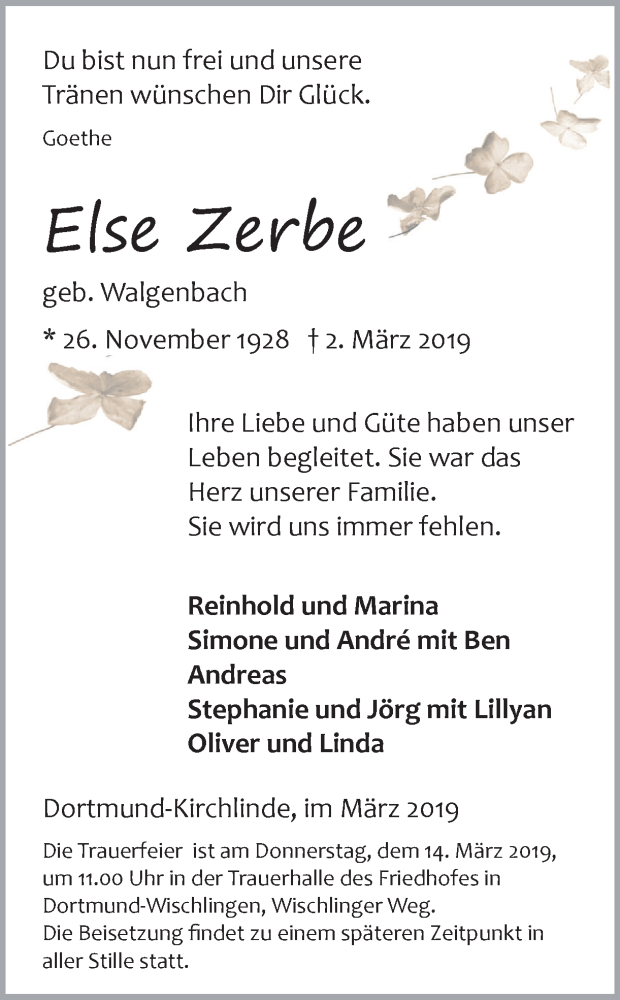 Hier finden Sie alle Traueranzeigen aus der Zeitung, die bisher für Else Zerbe erschienen sind. Weitere Traueranzeigen, die in der Zeitung erscheinen, werden hier ebenfalls aufgelistet