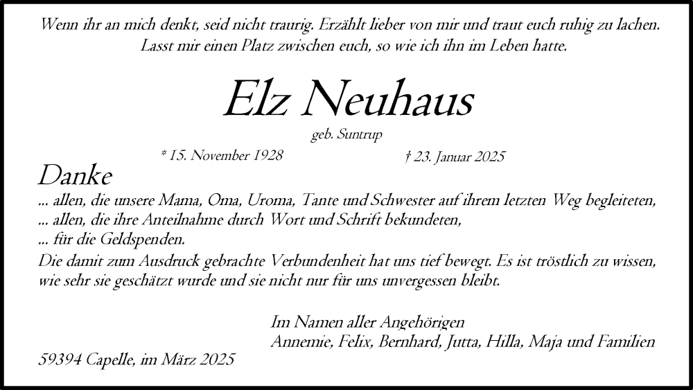 Hier finden Sie alle Traueranzeigen aus der Zeitung, die bisher für Elz Neuhaus erschienen sind. Weitere Traueranzeigen, die in der Zeitung erscheinen, werden hier ebenfalls aufgelistet