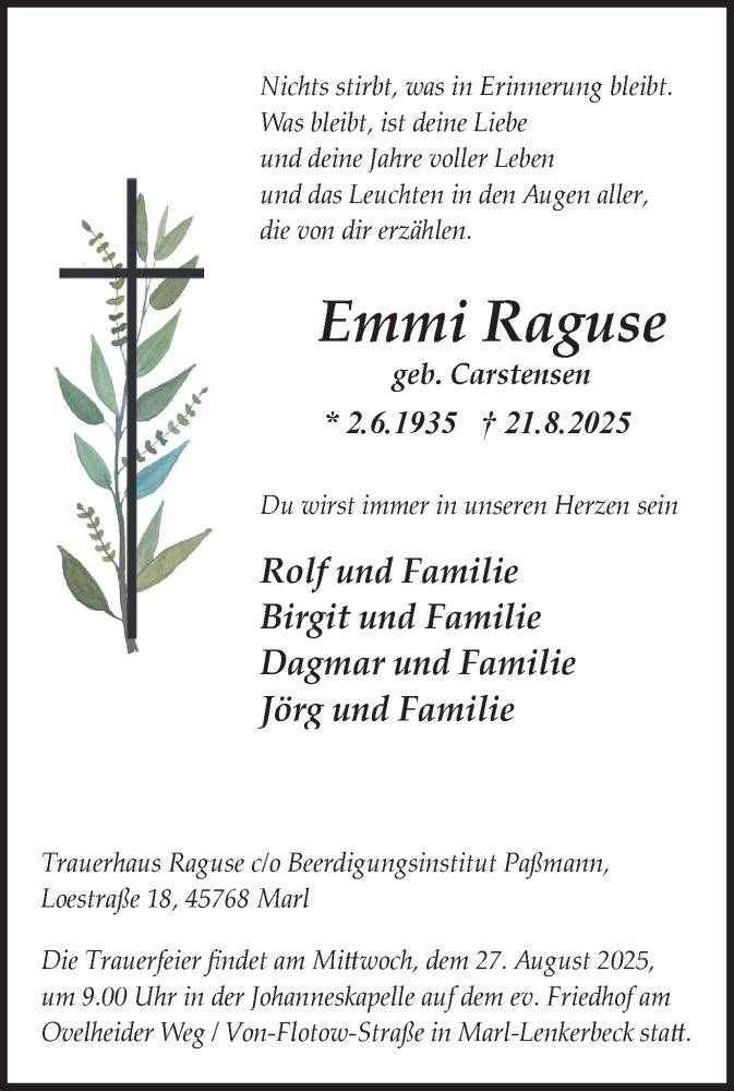 Hier finden Sie alle Traueranzeigen aus der Zeitung, die bisher für Emmi Raguse erschienen sind. Weitere Traueranzeigen, die in der Zeitung erscheinen, werden hier ebenfalls aufgelistet