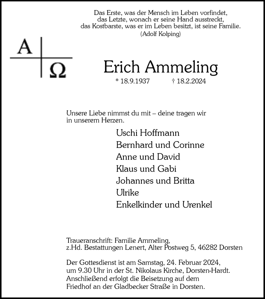 Hier finden Sie alle Traueranzeigen aus der Zeitung, die bisher für Erich Ammeling erschienen sind. Weitere Traueranzeigen, die in der Zeitung erscheinen, werden hier ebenfalls aufgelistet