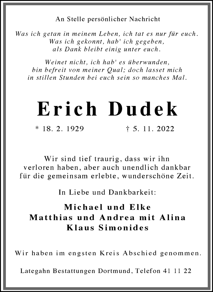 Hier finden Sie alle Traueranzeigen aus der Zeitung, die bisher für Erich Dudek erschienen sind. Weitere Traueranzeigen, die in der Zeitung erscheinen, werden hier ebenfalls aufgelistet