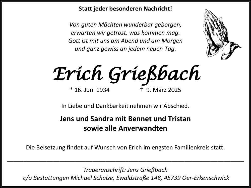 Hier finden Sie alle Traueranzeigen aus der Zeitung, die bisher für Erich Grießbach erschienen sind. Weitere Traueranzeigen, die in der Zeitung erscheinen, werden hier ebenfalls aufgelistet