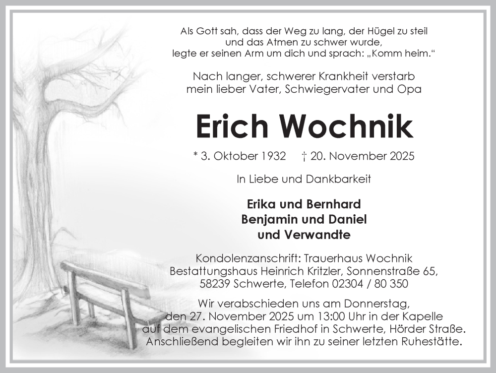 Hier finden Sie alle Traueranzeigen aus der Zeitung, die bisher für Erich Wochnik erschienen sind. Weitere Traueranzeigen, die in der Zeitung erscheinen, werden hier ebenfalls aufgelistet