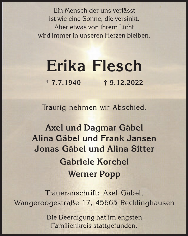 Hier finden Sie alle Traueranzeigen aus der Zeitung, die bisher für Erika Flesch erschienen sind. Weitere Traueranzeigen, die in der Zeitung erscheinen, werden hier ebenfalls aufgelistet