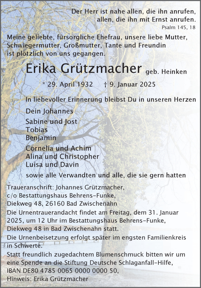 Hier finden Sie alle Traueranzeigen aus der Zeitung, die bisher für Erika Grützmacher erschienen sind. Weitere Traueranzeigen, die in der Zeitung erscheinen, werden hier ebenfalls aufgelistet