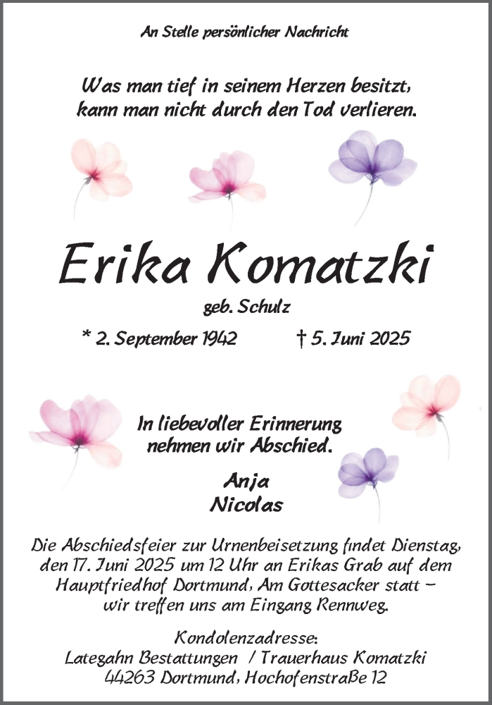 Hier finden Sie alle Traueranzeigen aus der Zeitung, die bisher für Erika Komatzki erschienen sind. Weitere Traueranzeigen, die in der Zeitung erscheinen, werden hier ebenfalls aufgelistet