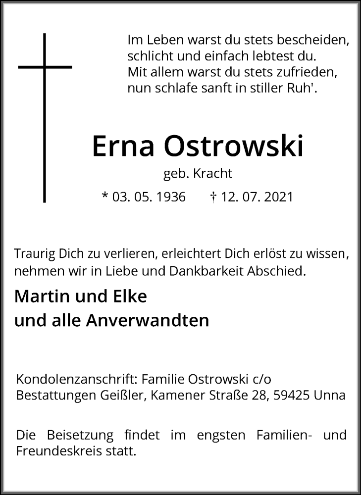 Hier finden Sie alle Traueranzeigen aus der Zeitung, die bisher für Erna Ostrowski erschienen sind. Weitere Traueranzeigen, die in der Zeitung erscheinen, werden hier ebenfalls aufgelistet
