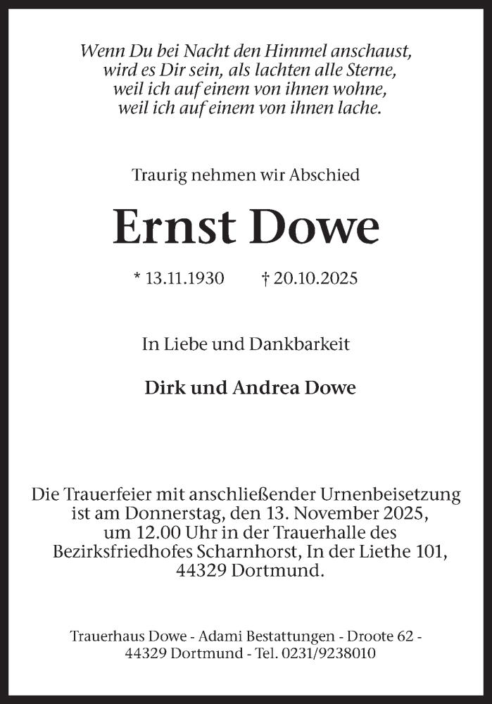 Hier finden Sie alle Traueranzeigen aus der Zeitung, die bisher für Ernst Dowe erschienen sind. Weitere Traueranzeigen, die in der Zeitung erscheinen, werden hier ebenfalls aufgelistet