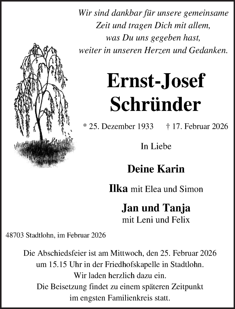 Hier finden Sie alle Traueranzeigen aus der Zeitung, die bisher für Ernst-Josef Schründer erschienen sind. Weitere Traueranzeigen, die in der Zeitung erscheinen, werden hier ebenfalls aufgelistet