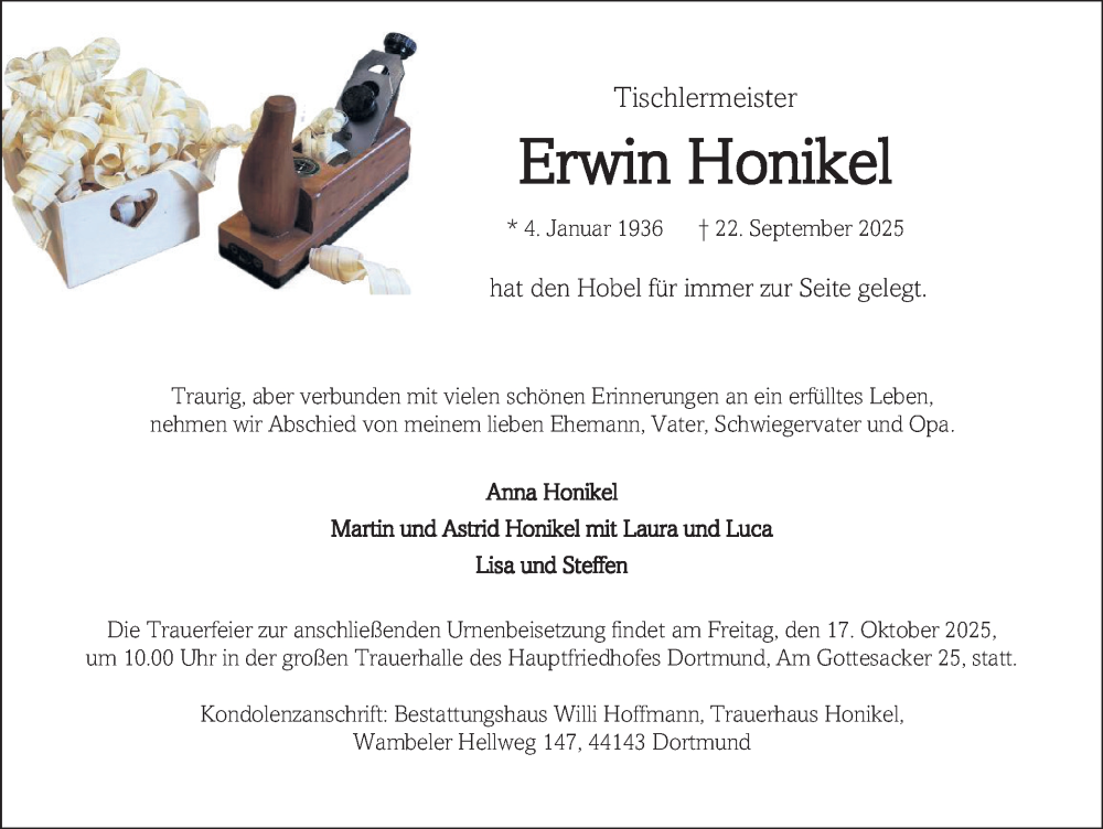 Hier finden Sie alle Traueranzeigen aus der Zeitung, die bisher für Erwin Honikel erschienen sind. Weitere Traueranzeigen, die in der Zeitung erscheinen, werden hier ebenfalls aufgelistet